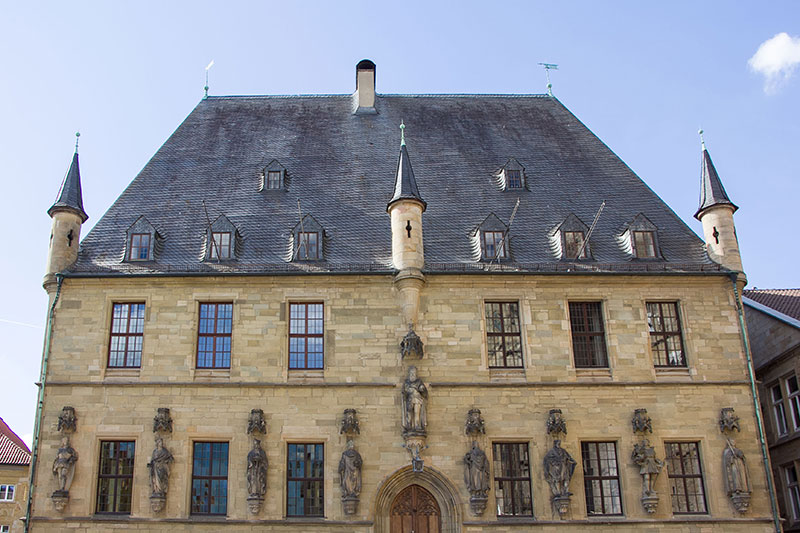 die Friedensstadt. Hier im spätgotischen Rathaus (erbaut 1487-1512) wurde am 25. Okt. 1648 nach 30 Jahren Krieg der Frieden verkündet.