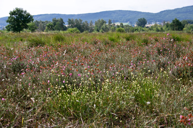 Einige Typische Pflanzen des Hochmoores: Sumpfkratzdiestel, Sumpziest, Blutweiderich, Gelbweiderich und Bittersüßer Nachtschatten. Der Lungenenzian und das Knabenkraut, eine einheimische Orchideenart sind dagegen schon etwas Besonderes.